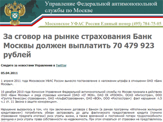 Как говорится в сообщении ведомства, 10 декабря комиссия УФАС признала в действиях банка и ряда страховых компаний ("Страховая группа МСК", "РОСНО", "Ингосстрах", "Группа Ренессанс страхование", "АльфаСтрахование", "ВСК", "Росгосстрах") факт нарушения закона о защите конкуренции.