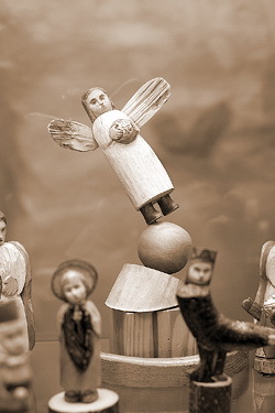 В противоположность театральной неоднозначности, под знаком которой живёт выставка в целом, на ясной православной ноте «звучит» витрина Н. И. Салтан, о творчестве которой я также рассказывал в прошлом. [ 3 ] Её точёные из дерева «солдатики» крещёного мира, а также предивные Сирины народных сказок и добрый Ангел, взмывший над всем без грозной трубы, дают вспомнить и о Великом посте, и о русской почве, по которой мы ходим.