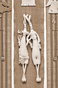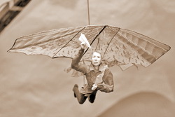 Псковский театральный художник Галина Изотова (творчеству которой я уже посвятил статью «Страна атласных баут» [ 1 ]) также представлена в Приказной палате несколькими своими лучшими работами. Это, в первую очередь, «Трубочист и Пастушка», кружащиеся в счастливом вальсе. Это, кроме того, «Дельтапланерист», тоже держащийся в данном случае на одной из старинных кованых связей свода палаты. Летя на неверных матерчатых крыльях и имея ещё в руке крохотный бумажный «самолётик» (какие складывают из тетрадных листов), он ярко символизирует экзистенциальную ситуацию художника вообще.