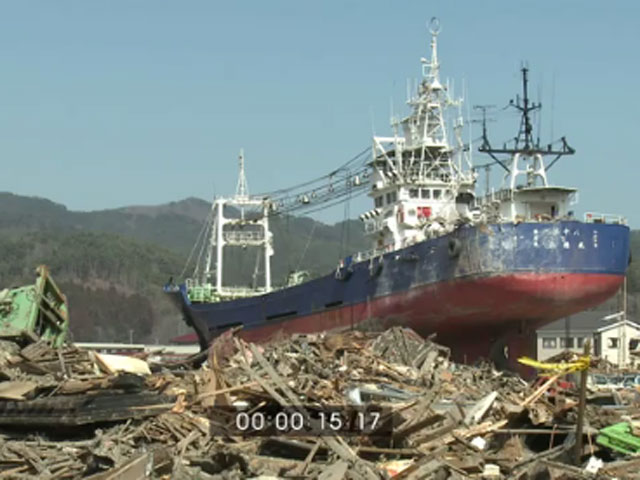 В записи видны целые поля покореженного ржавого железа - автомобили, крыши домов, большие корабли, причем выглядит это так, словно цунами прошло давным-давно и эти места с тех пор были заброшены. Некоторые дома буквально перевернуты вверх дном, сквозь разрушенные стены кое-где видна обстановка помещений - остатки мебели, в некоторых окнах трепещут занавески.