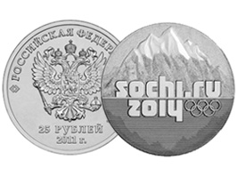 Центральный банк презентовал 15 апреля монетную программу «Сочи-2014», сообщает пресс-служба ЦБ. Из золота и серебра будут выпущены памятные монеты 34 видов, а также 3 инвестиционные монеты: золотые в половину и четверть унции и серебряная весом в одну тройскую унцию. В широкое обращение тиражом в 30 миллионов штук будут выпущены 25-рублевые монеты из медно-никелевого сплава (из него же выполнены монеты в 1 — 5 рублей). 25-рублевые монеты будут размером с «биметаллическую» десятирублевку.