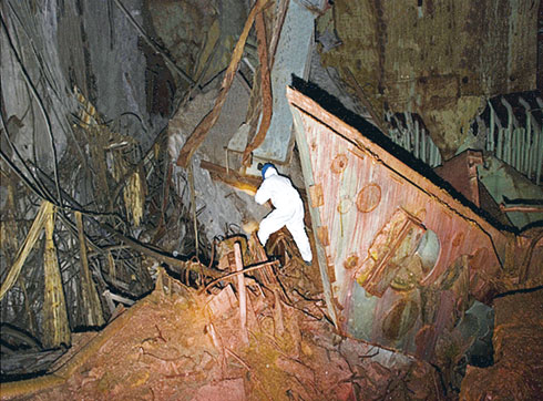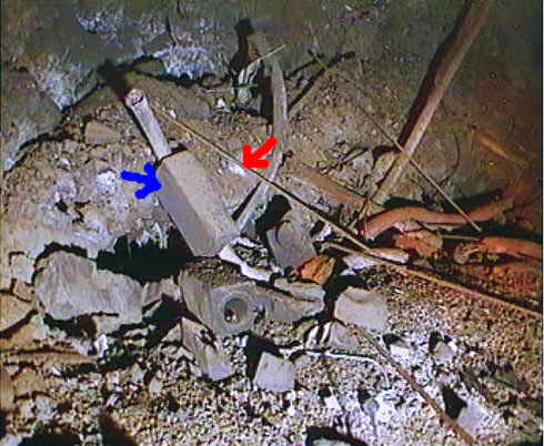 Вот это — циркониевая трубочка (▼), внутри которой таблетки окиси урана. Обычно эта трубочка внутри графитового блока, а здесь она свободно валяется. Здесь все перемешалось: топливо с бетоном, который вокруг, с графитом, с металлической конструкцией. Здесь доза составляет 32 тысячи рентген в час… Нам для работ в этих зонах давали роботов — японских, немецких привозили, все они сдохли сразу, поэтому у нас работал наш собственный робот. Хитрость была очень простая: в нем не было никакой электроники — он через кабель управлялся. А это фрагменты активной зоны. А это вот та самая пыль проклятая.