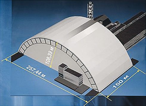 Срок годности А был какой-то еще вариант? Был. Строить копёр — такой большой металлический шатер (рисунок внизу). Он должен был полностью изолировать всю площадь: длиной порядка 150 метров и высотой метров 80. То есть огромный такой ангар. Прокладывались рельсы, он на них ставится и наезжает.