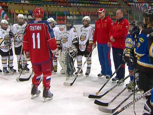 Премьер вышел на лед с клюшкой, в красно-синей форме с номером 11. Перед началом тренировки Путин поприветствовал финалистов: "Я вас поздравляю с выходом в финал!". Ребята в ответ постучали клюшками по льду.