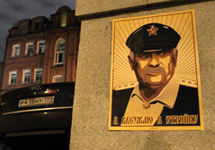 Неизвестные обклеили портретами кинорежиссера Никиты Михалкова здания в Малом Козихинском переулке, где идет строительство скандально известной гостиницы. Как передает LifeNews, изображение выполнено в стиле 20-х годов: режиссер изображен в фуражке советского кондуктора и погонах генерал-полковника, за спиной расходятся широкие лучи-полосы. Портреты сопровождает подпись, стилизованная под плакаты времен революции: "Я въезжаю в стройку". По данным издания, плакатами оклеен даже вход в местный пункт милиции.