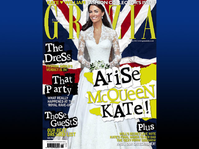 На обложке британского издания Grazia Кейт Миддлтон изображена в свадебном платье от модного дома Alexander McQueen на фоне гигантского национального флага. Ее талия выглядит неестественно тонкой по сравнению с линией бедер - словно стянута китовым усом, по моде XVIII-XIX веков.