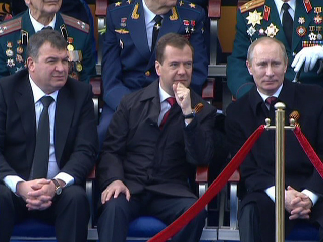 Впрочем, как отмечает GZT.ru, прошлогодний парад стал первым, который Медведев принял сидя. В предъюбилейный 2009 год президент и премьер с серьезными торжественными лицами наблюдали за маршем нарядных военнослужащих под палящим солнцем стоя. Годом ранее 9 мая Медведев также стоял, пока ветераны Великой Отечественной войны за его спиной отдавали честь участникам праздничного парада.