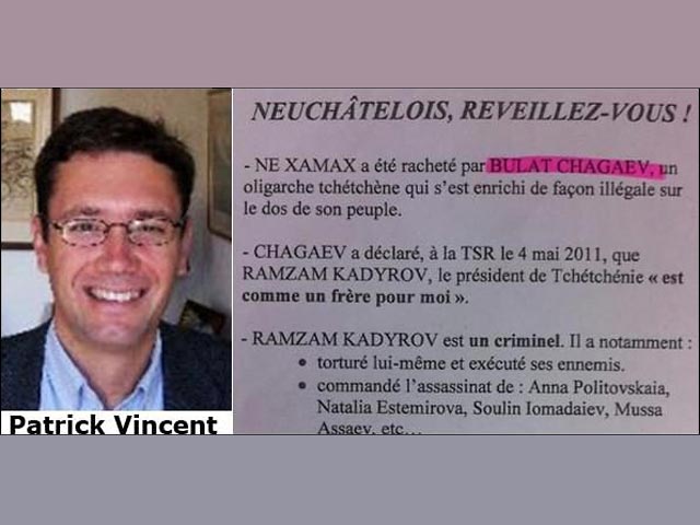 Профессор Университета Невшателя, заместитель декана факультета филологии и гуманитарных наук Патрик Венсан распространил в населенных пунктах одноименного швейцарского кантона анонимные листовки с резкими выпадами в адрес нового владельца местного футбольного клуба "Ксамакс" Булата Чагаева и чеченского президента Рамзана Кадырова.