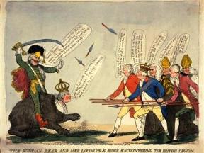 С XVIII в. и до наших дней в европейской карикатуре и журналистской риторике медведь выступает устойчивым атрибутом российского государства и субститутом ее верховного правителя (царя-императора-генсека-президента)[1]. Законодателями в этом были английские графики, которые первыми освоили массовое производство сатирических листов на актуальные политические темы. Самые ранние графические работы, на которых медведь выступал визуальным маркером России, фиксируются в Англии еще в 1737—1740 гг. — это серия аллегорических гравюр «Европейская гонка» («The European Race»)[2]. С конца XVIII в. «русский медведь» стал почти хрестоматийным образом в политическом бестиарии карикатуристов Великобритании, а позднее — с периода Крымской войны — и других стран[3].