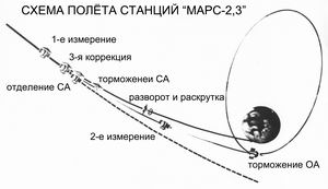 Как выяснилось потом при разборе неудачи, «Марс-2» шел к «Красной планете» очень точно. Ориентация до отделения от орбитального блока практически не отличалась от расчетной. В этом случае до отделения спускаемого аппарата и его закрутки вокруг продольной оси работа системы ориентации станции не требовалась. Однако из-за ошибки в программе БЦВМ восприняла ситуацию неправильно и нарушила ориентацию. Через 15 минут после отделения включилась твердотопливная двигательная установка, которая все-таки обеспечила перевод спускаемого аппарата на траекторию попадания на Марс.