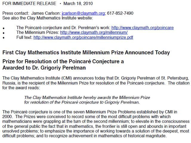 В связи с болезнью матери Перельмана выяснилось: институт Клэя уже пристроил его миллион