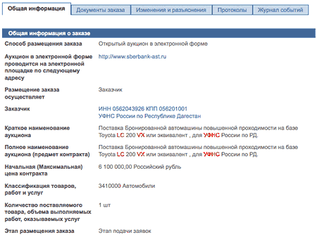 Управление Федеральной налоговой службы по Дагестану разместило на сайте госзакупок заказ на приобретение автомобиля Toyota Land Cruiser 200 VХ стоимостью 6,1 млн рублей. Согласно требованиям, роскошный внедорожник должен иметь бронированный кузов пятого уровня защиты, кожаный салон и множество других опций для комфортных поездок.