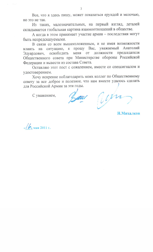 В связи со всем вышеизложенным, и не имея возможности влиять на ситуацию, я прошу Вас, уважаемый Анатолий Эдуардович, освободить меня от должности председателя Общественного совета при Министерстве обороны Российской Федерации и вывести из состава Совета.
