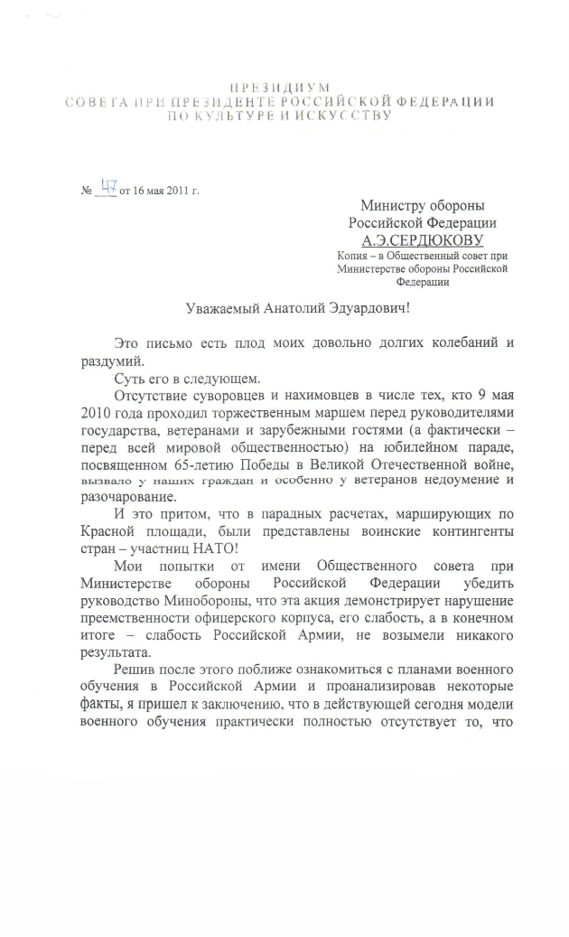 Копия – в Общественный совет при Министерстве обороны Российской Федерации. А.Н.Каньшину, лично конфиденциально.