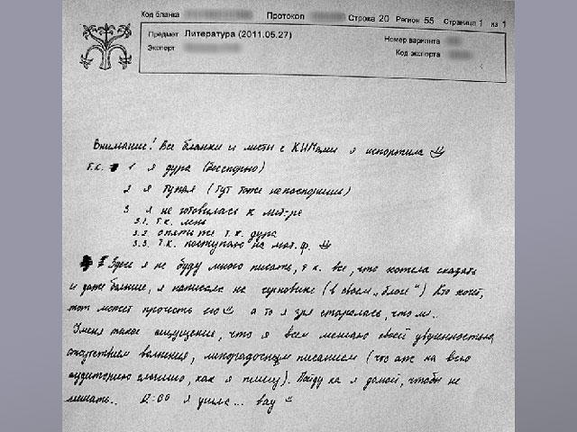 Впрочем, на самом деле в прошлом году омский школьник тоже оставил не менее оригинальную запись на своем экзаменационном бланке. Свои ответы на вопросы он сопроводил обращением к комиссии с просьбой поставить ему больше баллов, чтобы "не отягощать родителей платой за обучение на коммерческой основе", пишет 1obl.ru.