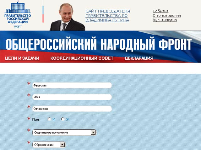 Граждане России получили возможность вступить в Общероссийский народный фронт (ОНФ), создание которого было инициировано премьер-министром Владимиром Путиным. Со вторника, 7 июня, на сайте председателя правительства появился раздел, дающий такую возможность любому желающему россиянину.