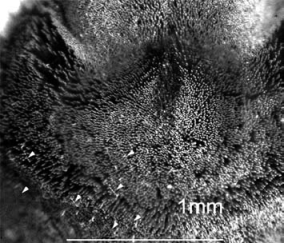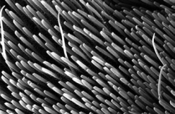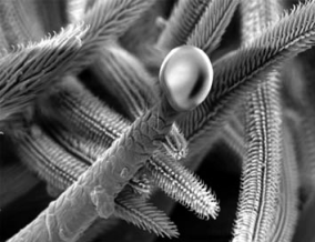 В распоряжении исследователей были шкурки не только Флаффи, но и двух других видов птицеедов: чилийского розового и индийского декоративного Poecilotheria regalis. Их рассмотрели с помощью сканирующего электронного микроскопа и увидели особые «паутинные щетинки», ребристые и конические, которые возвышались над щеточкой обычных волосков, густо покрывающих паучьи лапки. Ширина этих щетинок, которые д-р Ринд назвала спиготами (spigot), составляет около 0,01 мм. На кончике каждой паутинной щетинки есть отверстие, из которого выделяется шелк. Исследователям даже удалось сфотографировать застывшую паутинную капельку около 20 мкм в диаметре.
