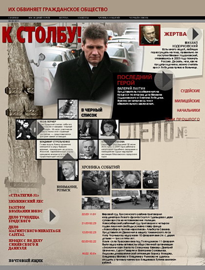Теперь все-таки о том, на что уже (и будут) потрачены ваши деньги. С сентября месяца мы запускаем новый проект под названием «К столбу». Это будет такая, в определенном смысле, кунсткамера российских антигероев. Под рубрикой «Их обвиняет гражданское общество» уже собрана целая коллекция дивных персонажей — от прокурора Лахтина, гособвинителя Ходорковского и Лебедева, и судьи Боровковой, отличившейся во время суда над Немцовым, до, например, Льва Смирнова, председательствовавшего на процессе по делу Даниэля и Синявского, или Якова Лернера, одного из вдохновителей суда над «тунеядцем» Иосифом Бродским.