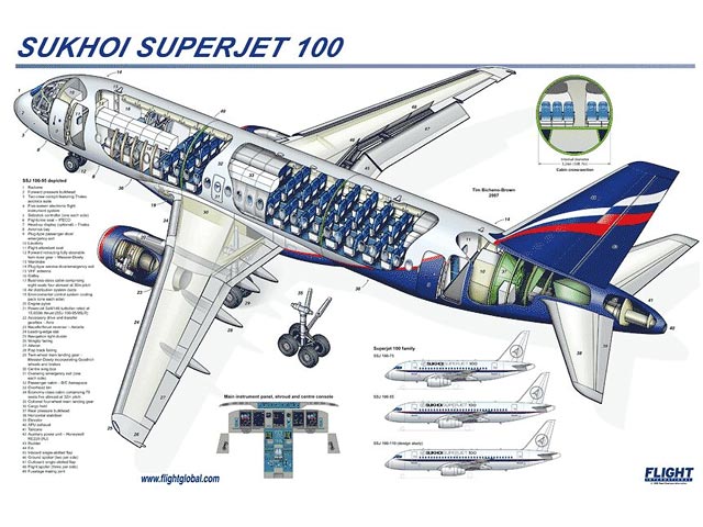 Ближнемагистральный пассажирский самолет Sukhoi Superjet 100 рассчитан на перевозку до 98 пассажиров на расстояние до 4,4 тысячи километров. Первый Superjet 100 был представлен публике 26 сентября 2007 года на заводе в Комсомольске-на-Амуре, там же 19 мая 2008 года он успешно совершил первый полет.