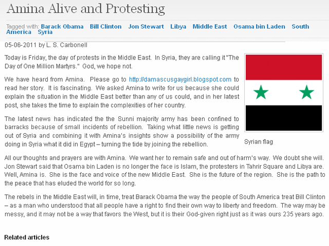 Истории за подписью "Амина Арраф" публиковались в блоге, поддержку которому оказала именно "Пола Брукс", ведь при ее содействии на сайте сексуальных меньшинств появилась ссылка на блог "нашей девочки в Дамаске".