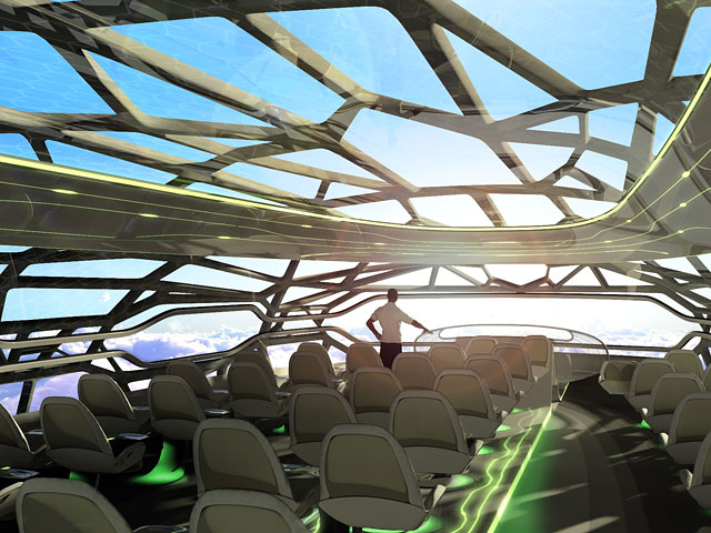 Бионическая структура самолета сравнима с птичьим скелетом: легкая и прочная. Интеллектуальные мембраны на стенах кабины, контролирующие температуру воздуха, могут стать прозрачными для того, чтобы пассажиры насладились панорамным видом.