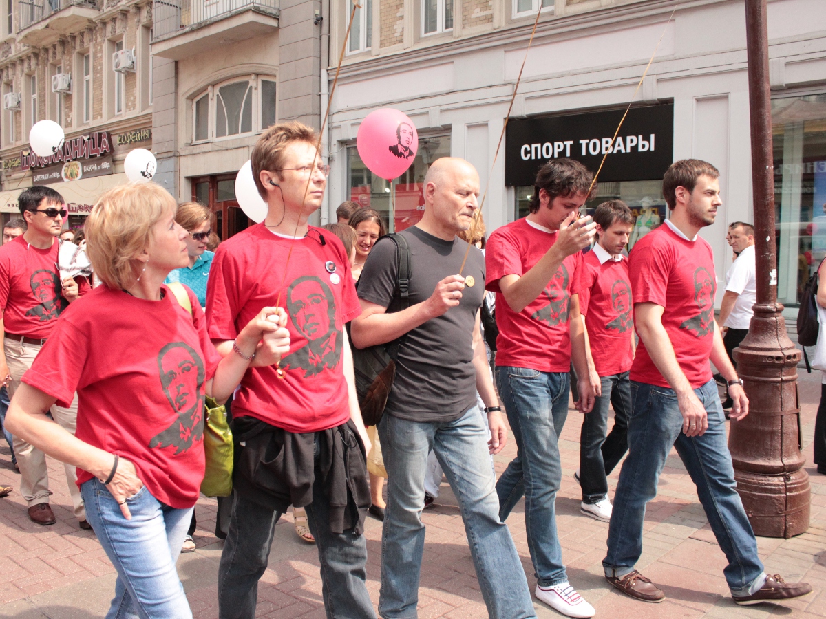 Акция, в российской столице приуроченная ко дню рождения Ходорковского, началась в три часа дня на Старом Арбате. Несколько десятков человек, преимущественно активисты движения «Солидарность» собрались у ресторана Прага и двинулись колонной по знаменитой пешеходной улице. Полиция, практически, сразу стала задерживать людей, одетых в красные футболки с портретом Ходорковского, в автозаке оказались член "Солидарности" Семен Зон-Зам и активистка Елена Букварева. Последняя раздавала участникам акции воздушные шары с изображением Михаила Ходорковского. Шествующие бурно реагировали на действия омоновцев.