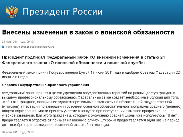 Президент России Дмитрий Медведев подписал Федеральный закон "О внесении изменения в статью 24 Федерального закона "О воинской обязанности и воинской службе", предусматривающий отсрочку от призыва до 1 октября для 18-летних выпускников, набравших проходной балл по ЕГЭ, передает ИТАР-ТАСС. Закон был принят Госдумой 17 июня 2011 года и одобрен Советом Федерации 22 июня 2011 года.
