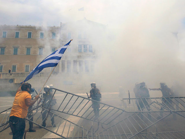 Греческих манифестантов разгоняют газом, они в ответ бьют полицейских палками от транспарантов