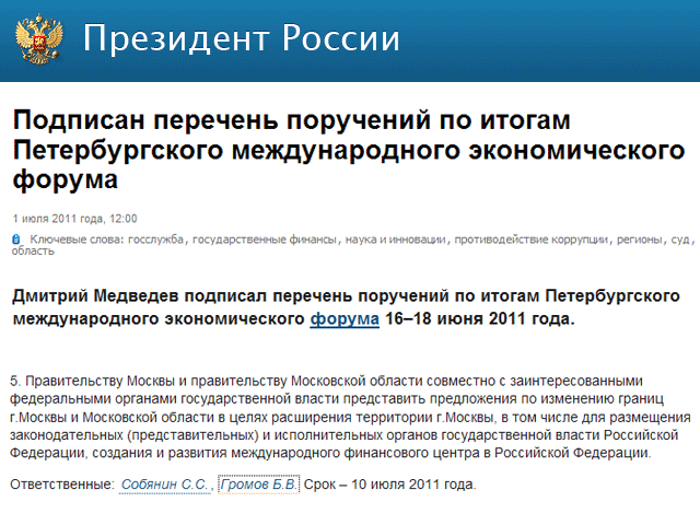 После того, как Медведев озвучил на петербургском форуме свой замысел расширения Москвы и выселения чиновников за ее пределы, Собянин на следующий же день, по его словам, связался с Громовым и предложил совместными усилиями решать поставленную президентом задачу.