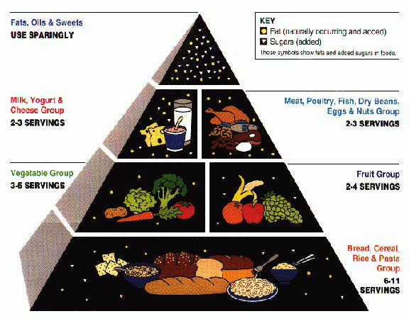 Пищевая пирамида была представлена широкой публике на пресс-конференции в апреле 1992 года. Пирамида состояла из шести групп продуктов и рекомендуемых порций. В основание пирамиды была положена углеводная группа. Это продукты, получаемые из зерновых, – хлеб, каши, рис и макаронные изделия. Их предлагалось потреблять от шести до одиннадцати порций в день. Овощи (3-5 порций) и фрукты (2-4 порций) составили следующий слой. Затем шли молочные продукты (2-3 порции) и продукты, богатые белком, такие как мясо, яйца, бобовые и орехи (тоже 2-3 порции). Верхушку пирамиды представляли жиры и сладости, которые рекомендовалось есть в минимальных количествах.