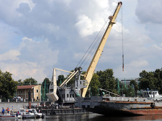 Затонувший на Москве-реке катер, на борту которого обозначен только судовой номер, поднят на поверхность. От верхней части судна практически ничего не осталось, кроме досок. Катер с пассажирами затонул сегодня ночью, после того, как на большой скорости врезался в пришвартованную у причала баржу "Ока-5" в районе Лужнецкой набережной.