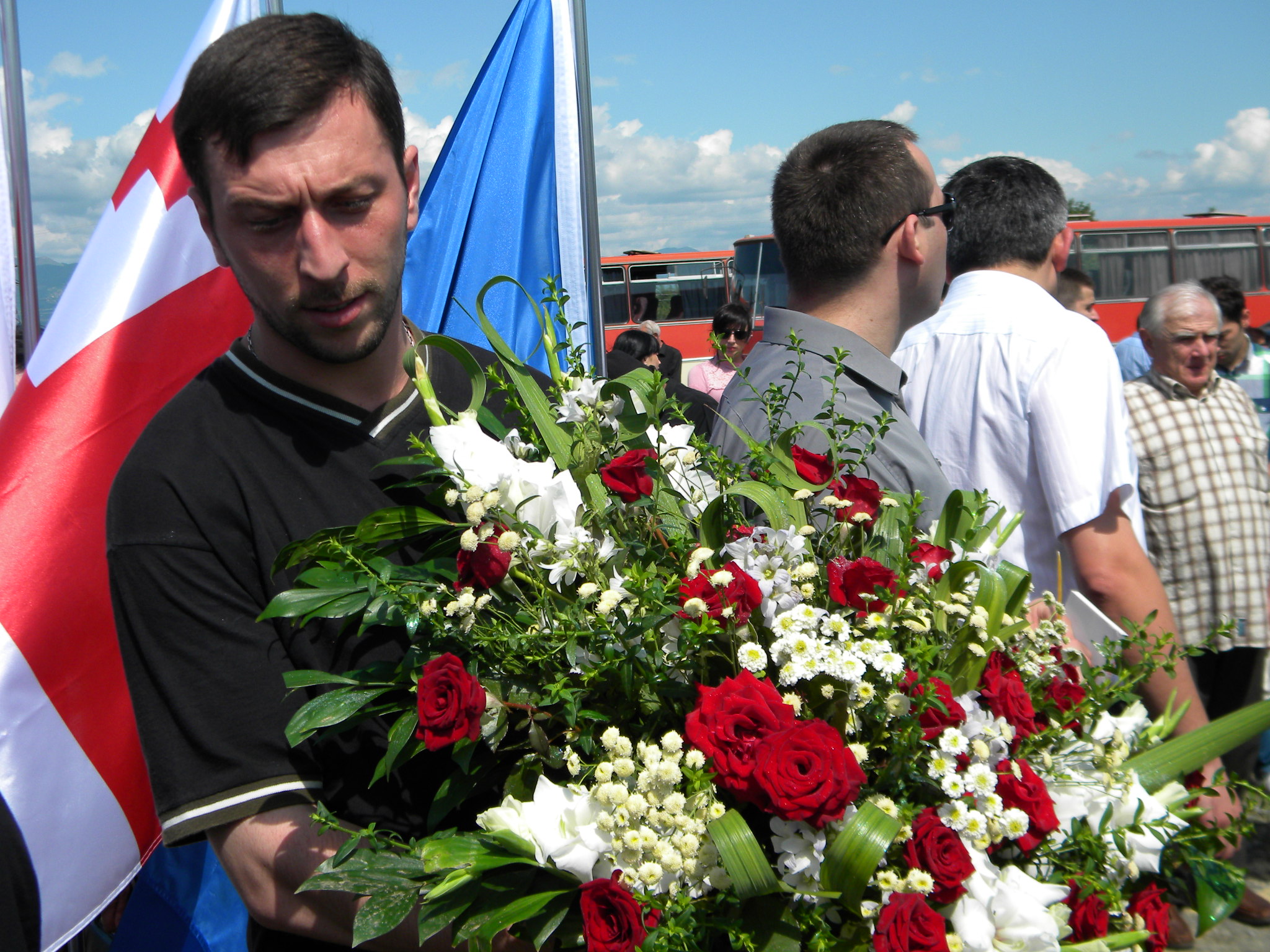 Примечательно, что впервые официальные лица и простые граждане надели значки в форме красного цветка (грузинский аналог "Георгиевской ленточки"), который отныне ежегодно, в течении недели будет символизировать скорбь и память о погибших.