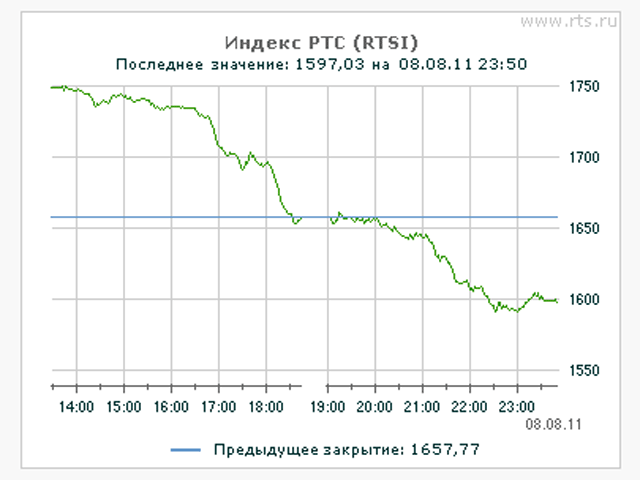 Биржа РТС начала торги вторника падением индекса на 3,67% - ниже 1600 пунктов, до 1597,01 пункта, после обвала почти на 8% накануне, последовавшего за решением агентства S&P снизить долгосрочный кредитный рейтинг США, следует из данных бирж.