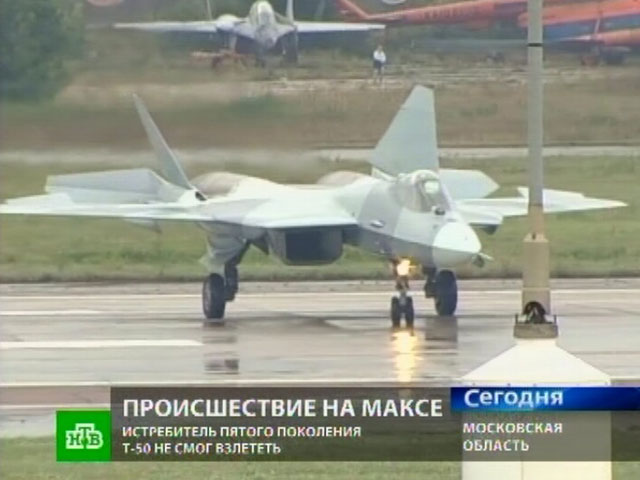 Новейший российский истребитель пятого поколения Т-50, который будет передан на вооружение ВВС, в воскресенье по техническим причинам прекратил взлет с ВПП аэродрома Жуковский, пилот жив. При разгоне истребителя на полосе была видна вспышка, после чего самолет остановился с выпущенным тормозным парашютом.