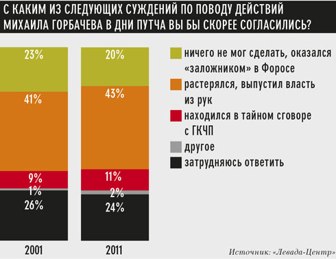 К 20-летию попытки государственного переворота в СССР «Левада-Центр» провел всероссийский опрос об отношении граждан к тем событиям. «Демократической революцией» смену власти в стране в августе 1991 года признают лишь 10% опрошенных (в 1994 году таких насчитывалось 7%). В то же время, если в начале 90-х попытку путча называли «обычным эпизодом борьбы за власть» 53% россиян, то сегодня так считают немногим более трети. А на первое место в оценке произошедших двадцать лет назад событий вышла формулировка «трагическое событие, имевшее гибельные последствия для страны и народа». В июле 2011 года с этим согласились рекордные за все время наблюдений 39% опрошенных.