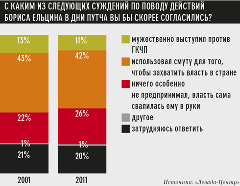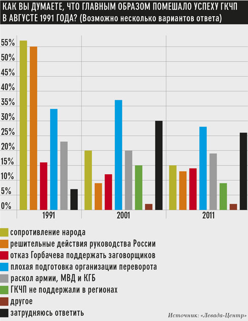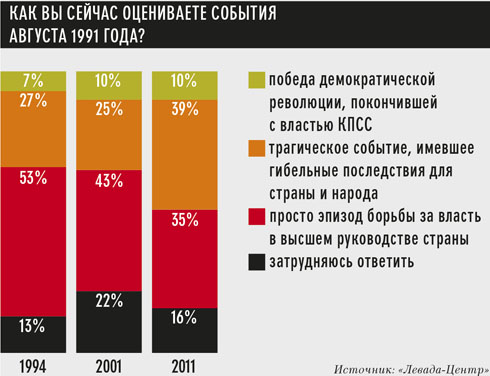 Казалось бы, налицо почти тотальное неприятие обществом «ураганных 90-х». И все же социологи просят не спешить с выводами. «Динамика мнений, которую мы наблюдаем в отношении россиян к 1991 году, говорит прежде всего об их оценке настоящего, — пояснил The New Times замдиректора «Левада-Центра» Алексей Гражданкин. — Столь негативная реакция на события путча наблюдается всякий раз, когда общество сильно устает от действующей власти».