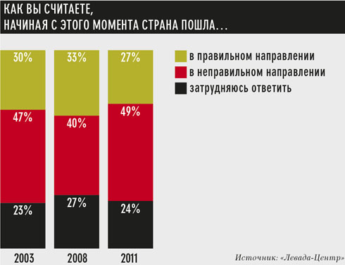 Еще дальше в своих выводах на основе данных «Левада-Центра» идет социолог, главный редактор журнала «Искусство кино» Даниил Дондурей. «Эти данные только подтверждают мое убеждение в том, что одна из главных, если не самая главная проблема развития России за двадцать лет так и не решена, — говорит он. — Получается, что нация не принимает существующий строй и те принципы жизни, по которым ей предписано жить Конституцией. Это примерно то же самое, как если бы спустя двадцать лет после большевистского переворота, в году так 1937-м, Сталин и вся верхушка ВКП (б) узнали бы, что 3/4 населения страны ужасно страдает по поводу гибели монархии и воспринимают ее крах как «величайшую геополитическую катастрофу».
