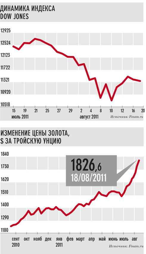 По мере того как инвесторы теряют доверие к валютам, акциям и облигациям, золото дорожает, причем много месяцев подряд. Рекордным стало 18 августа — цена за тройскую унцию (31,1 г) на мировых биржах составила $1826,6. Скорее всего, это не предел: фьючерсы на золото с поставкой в декабре на Нью-Йоркской бирже торгуются уже свыше $1850. Эксперты обратили внимание: каждая негативная мировая экономическая новость словно придает золоту сил. Стоило главам Германии и Франции отказаться от размещения еврооблигаций, призванных улучшить ситуацию с долгами стран Евросоюза, как драгметалл сразу подорожал на 1,5%. После снижения кредитного рейтинга США (см. The New Times № 25 от 15 августа 2011 г.) и, соответственно, доверия к американским гособлигациям (бондам) инвесторы, похоже, и вовсе не видят иного «острова стабильности», кроме золота.