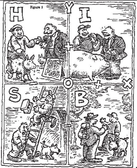 Третий базовый закон предполагает, хоть и не заявляет об этом явно, что человеческие существа делятся на несколько категорий: беспомощные, разумные, бандиты и глупцы. Проницательный читатель легко узнает их в четырех областях I, H, S, B на простой диаграмме: