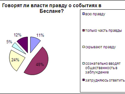 – Надо понимать, что стоит за такими оценками. Сегодня подавляющее большинство россиян считают, что они и их близкие могут стать жертвой террористических атак. То есть мы фиксируем очень высокий уровень встревоженности, ощущение опасности, собственной незащищенности. Что касается тактики борьбы с терроризмом, то 60 процентов опрошенных убеждены: в случаях, подобных бесланскому, когда захватывается большое количество заложников (тем более, если среди них есть дети), главное – не допускать крови, не допускать жертв. В Беслане было очень много жертв, и при этом большинство погибших – дети. Поэтому отношение к Беслану как к трагедии, как к реальному воплощению опасности сохраняется до сих пор. При этом большинство россиян, во-первых, считают, что тогда не было сделано все, что возможно, чтобы операцию провести с минимальными жертвами и даже без жертв, и, с другой стороны, что власти и тогда не говорили, и сейчас не говорят правды.