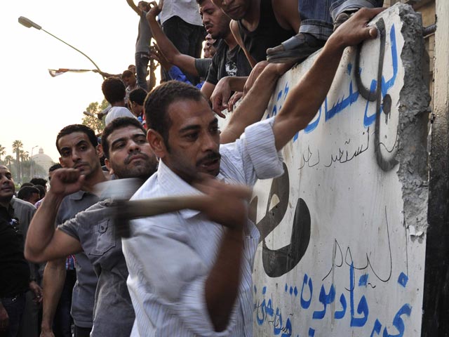 Прологом к хаосу, в который вновь погружается Каир, послужила акция протеста, организованная накануне после пятничной молитвы молодежными движениями с требованием разорвать все отношения с Израилем. Десятки человек, вооружившись кувалдами и самодельным тараном, собранным из цепей, веревок и тяжелой металлической трубы, полностью снесли все заграждения, возведенные за неделю до этого вокруг высотки. Как сообщает NEWSru Israel, сотрудники служб безопасности не только не предотвращали вандализм, но даже принимали участие в погроме: телеканал Al-Jazeera показал, как один из офицеров берет молоток и присоединяется к погромщикам.