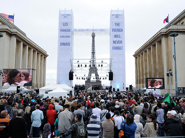 Ассоциация "Французы никогда не забудут", созданная проживающими в США французскими предпринимателями, ежегодно отдает дань памяти жертвам терактов 11 сентября. На десятую годовщину трагедии они воссоздали разрушенные башни ВТЦ на символичном для французов месте - площади Трокадеро между двумя зданиями- близнецами: павильонами дворца Шайо. "На левой башне написаны имена почти трех тысяч жертв, погибших в тот день при крушении "Всемирного торгового центра". На правой башне - послания, которые мы собрали, благодаря ассоциациям и комитетам, через Facebook, Twitter - отовсюду, там сотни сообщений", - заявил РИА "Новости" вице-президент ассоциации, архитектор Жан-Пьер Эм.