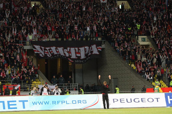 Прощальный матч Андрей Тихонова. Фото: Официальный сайт ФК «Спартак-Москва» - Основную часть времени с трибун, как и ожидалось, звучали лозунги, посвященные завершающему игровую карьеру футболисту. Показательной была перекличка в честь виновника торжества между спартаковскими и самарскими фанатами, сопровождавшаяся аплодисментами со стороны менее энергичных болельщиков.