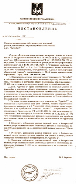 Постановление «О предоставлении права собственности на земельный участок, относящийся к имуществу общего пользования, причем бесплатно, дачному некоммерческому товариществу «Дружба-2» «с целью обеспечения прав и законных интересов граждан» подписал 2 февраля 2009 года мэр Пскова Михаил Хоронен. Общая площадь участка составила 27 433 кв. м., он был предоставлен товариществу «в целях ведения дачного хозяйства и уставной деятельности».