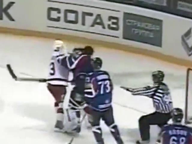 Через некоторое время канадец еще раз подъехал к выбранной жертве, сорвал с головы голкипера шлем и спровоцировал массовую потасовку.
