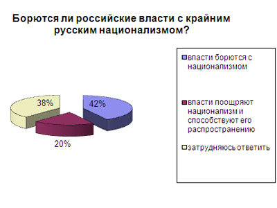 Чувствуете ли вы враждебность со стороны людей других национальностей? – такой вопрос задали россиянам социологи Аналитического центра Юрия Левады. «Очень часто», - отвечают 4% опрошенных, «довольно часто» - 14%. 27% граждан сталкиваются с этим явлением редко, и 50% - практически никогда. По сравнению с 2002-м годом последняя цифра уменьшилась на 10 процентных пунктов. В ответах на вопрос «чувствуете ли вы враждебность к людям других национальностей?» соотношение ответов примерно такое же. Более половины респондентов полагают, что число русских, разделяющих крайние националистические взгляды, за последние 5-6 лет выросло. Среди основных причин национализма люди называют вызывающее поведение национальных меньшинств, плохие условия жизни в России и террористические акты последних лет. 42% опрошенных считают, что российские власти борются с крайним русским национализмом, в то время как 20% граждан уверены, что власти поощряют национализм и способствуют его распространению.