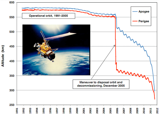 Космический аппарат UARS (Upper atmosphere research satellite) имеет величину почти 11 метров. Его масса составляет 6,5 тонны. Спутник был выведен на орбиту шаттлом Discovery 15 сентября 1991 года. Первоначально планировалось, что аппарат проработает на орбите три года, но он был выведен из эксплуатации лишь 14 декабря 2005 года. Токсичного топлива на его борту нет: оно было полностью выработано.