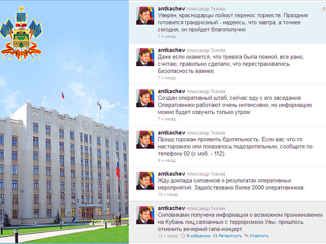 Тем временем, мэр Краснодара Владимир Евланов в своем микроблоге в Twitter сообщил, что информация о возможном теракте поступала "несколько раз вчера в течение дня, ... вечером тоже".