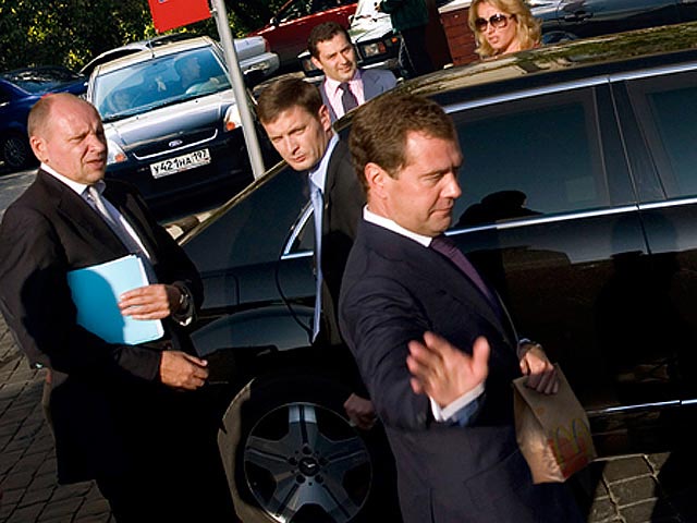 Снимок с президентом, якобы запечатленным после похода в McDonald's, появился на этой неделе на сайте medvedevphotos.com. На нем Медведев левой рукой держит пакет с едой, а жестом правой просит не снимать его. Рядом с главой государства изображены заместитель руководителя администрации президента Алексей Громов и пресс-секретарь президента Наталья Тимакова.