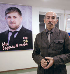 Новая школа впечатляет: просторные кабинеты с новыми партами, над доской — обязательные атрибуты: чеченский флаг, фотография Рамзана Кадырова и плакат со словами чеченского гимна. Портреты старшего и младшего Кадыровых — в каждом классе, кажется, их нет только в туалете. В коридоре целая галерея — Кадыров-старший с сыном и Кадыров-младший с матерью. В актовом зале — портреты уже побольше и торжественнее: Ахмат-Хаджи Кадыров в неизменной папахе, а Рамзан Кадыров с двумя орденами. Сбоку на стене — небольшой портрет Дмитрия Медведева.